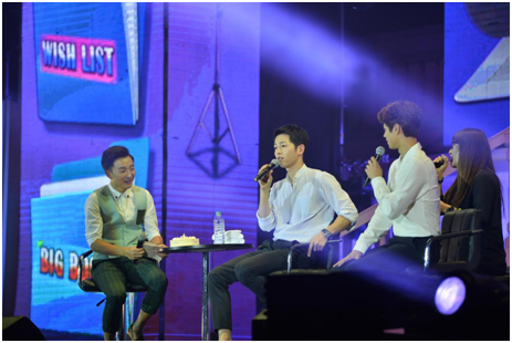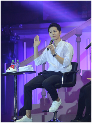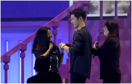 一身酷酷的黑套装,,一曲温暖深情的《好久不见》,,宋仲基以标准的中文演唱开启了粉丝见面会的第二部分互动。。。作为粉丝见面会现场游戏互动当然必不可少,,仲基欧巴现场亲自邀请热情粉丝一起还原《太后》浪漫场景,,,,拥抱、、、系鞋带、、、绑头发、、遮太阳....5位幸运粉丝激动的心情,,,幸福的表情,,现场摄影师拍下亲密瞬间,,,并由宋仲基现场签名赠送。。