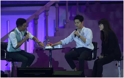 在长达两个小时的时间里,,宋仲基一直风趣幽默的和粉丝亲密沟通互动,,“给力”“完美”“吃饱了”都毫无压力的从仲基欧巴的口中说出,,,更是频繁的提到了李光洙欧巴,,,这么看来他可谓是仲基欧巴吃喝玩乐工作外出的居家必备!!!《太后》的经典桥段也是不出所料的出现在见面会中,,,,特别的是其中三个经典桥段是宋仲基亲自挑选,,,,并与主持人现场角色扮演,,引来粉丝尖叫连连!!!!